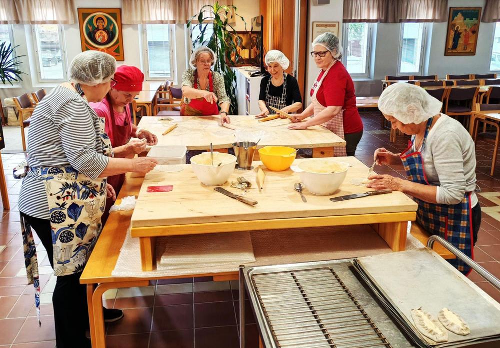 Salmi-seuran talkoolaiset uurastivat piirakoiden valmistuksessa.